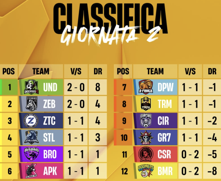 Dopo queste partite, la classifica vede fuori da tutto (come la settimana scorsa) FC Caesar e Boomers con 0 punti a testa e una differenza reti di -5 per i romani e di -8 per i ragazzi di Fedez. Rispetto alla classifica della settimana scorsa, però, notiamo immediatamente il tracolo di TRM FC e Gear 7 FC che da, rispettivamente, primi e secondi volano ottavi e noni avendo entrambi perso il match di giornata. Infine, l’occhio ricade sulle uniche due squadre per ora a punteggio pieno: Underdogs FC e Zebras FC che si prendono di diritto i primi due posti in classifica di questa settimana.