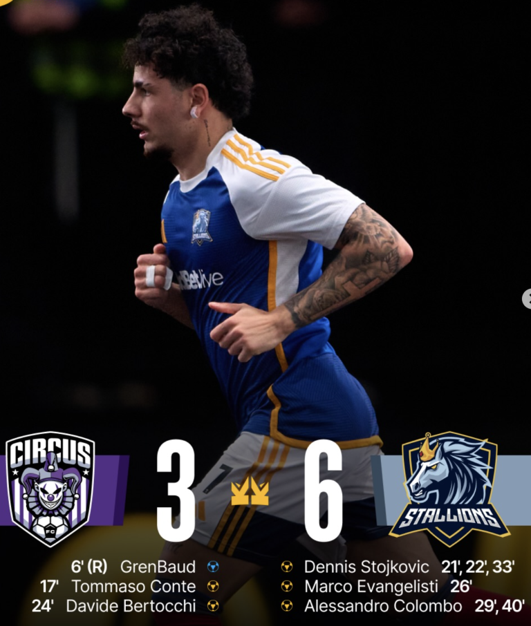 Alle 20:00 (sulla carta) si gioca una partita dalle rivalità intensissime: Circus FC contro Stallions. GrenBaud comincia forte chiamando al 6’ il rigore presidenziale e segnandolo, regalando subito il vantaggio ai suoi, che consolideranno con il gol di Conte prima dell’half time. Durante il dado è Dennis Stojkovic a riacciuffarla con una doppietta, stroncata poi al 24’ dal gol di Davide Bertocchi che riporta i pagliacci in vantaggio. Peccato sia anche l’ultima rete dei Circus FC che vedranno da quel momento gli Stallions segnarne altri 3 e Blur sbagliare il rigore presidenziale prima del matchball, per poi cedere definitivamente al 40’ per il gol di Alessandro Colombo che chiude la partita 3-6.