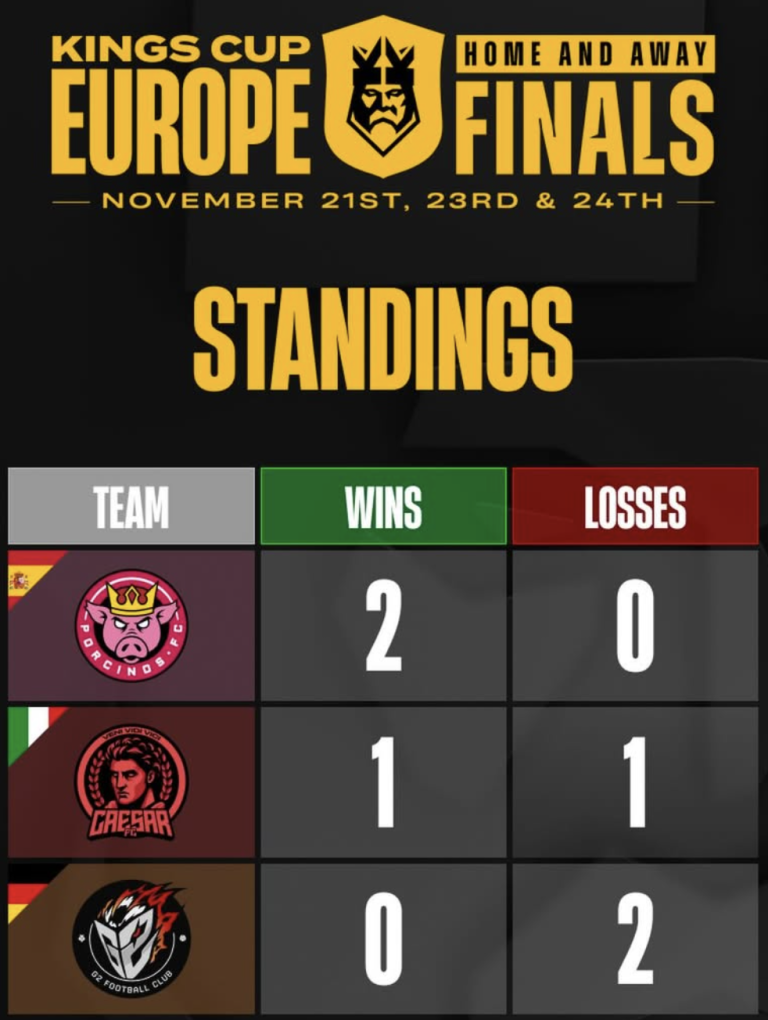 In Europa, invece, le squadre che si contendono il titolo sono tre (come spiegato nell’articolo precedente). Le prime due partite hanno visto i Porcinos FC e i FC Caesar affrontare i G2 FC, con due vittorie nette: 9-3 e 11-4. A questo punto delle Finals, la squadra tedesca è già fuori dalla corsa al trofeo, che viene così assegnato nello scontro diretto in casa degli spagnoli tra Porcinos FC e FC Caesar. La sfida, accesissima e combattuta, vede i due volte campioni del mondo spagnoli imporsi per 7-4, portandosi a casa la Kings Cup Europe 2025.