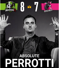 La partita delle 19:00 (già in ritardo come al solito) vede affrontarsi due grandi favorite per la corsa al titolo: Underdogs FC e Alpak FC. Infatti, è la partita con più reti della giornata, con un totale di 15 che favorisce Mirko Cisco per 8 a 7. Partita giocata con lo star player da entrambe le parti dal 6’ che entrambi, Matteo Perrotti per gli Underdogs FC e Christian Ronchi per KFrenezy, riescono a sfruttare al 7’ e al 12’. La partita si conclude al 41’ dopo il gol del pareggio dello stesso Ronchi al 40’ che si vede sfuggire il primo punto del campionato con la rete decisiva dei Perrotti, dopo una partita che entrambi hanno disputato da assoluti coprotagonisti.