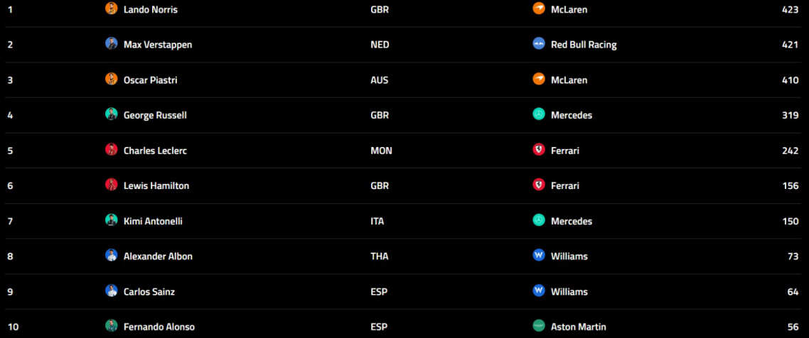 La vera delusione del campionato è stata Oscar Piastri: fino alla diciannovesima gara era leader della classifica, ma dagli Stati Uniti in poi ha accusato un inspiegabile calo di rendimento, perdendo concentrazione e lasciando sul piatto punti pesantissimi.
