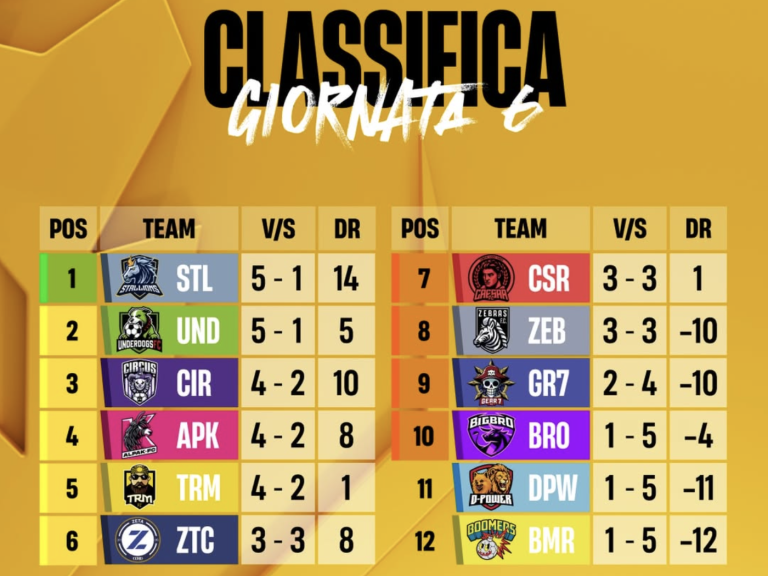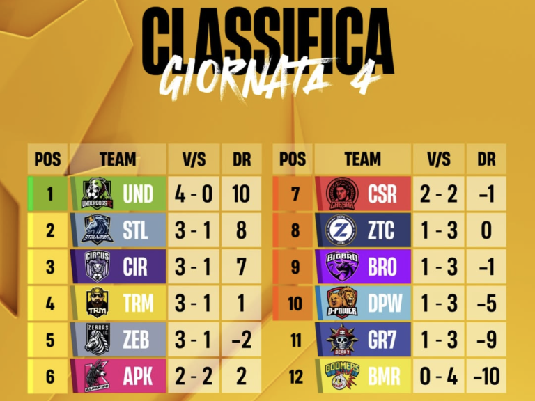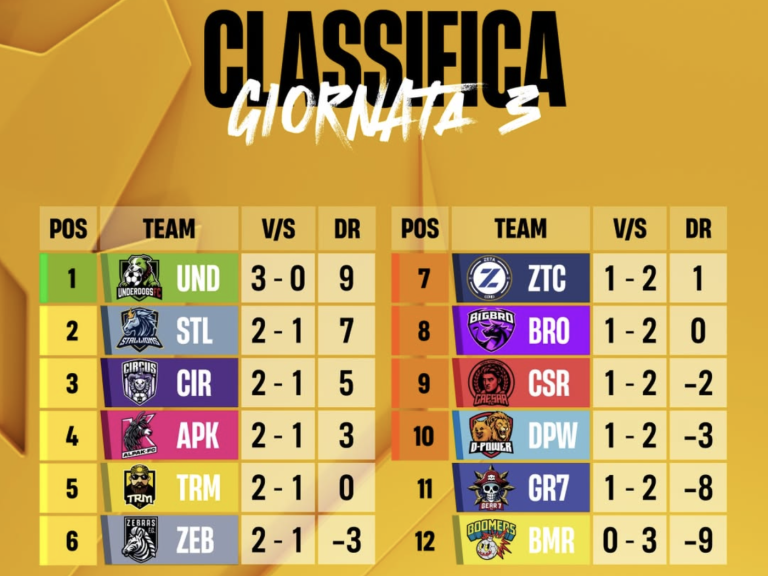 Concludiamo il recap con la giornata che più ha sconvolto la classifica. Con le sconfitte di Stallions e Underdogs, infatti, la corsa al titolo è completamente riaperta con ben 4 squadre a 5 punti, differenziate solo per la differenza reti, che possono, con la prossima giornata, portarsi al di sopra di tutte le altre. Oltre ai cani di Cisco, anche TRM e Gear 7 si ritrovano di due posizioni più in basso in classifica mentre i Boomers sembrano star rinascendo riuscendo a vincere nuovamente e raggiungendo la zona play-in.